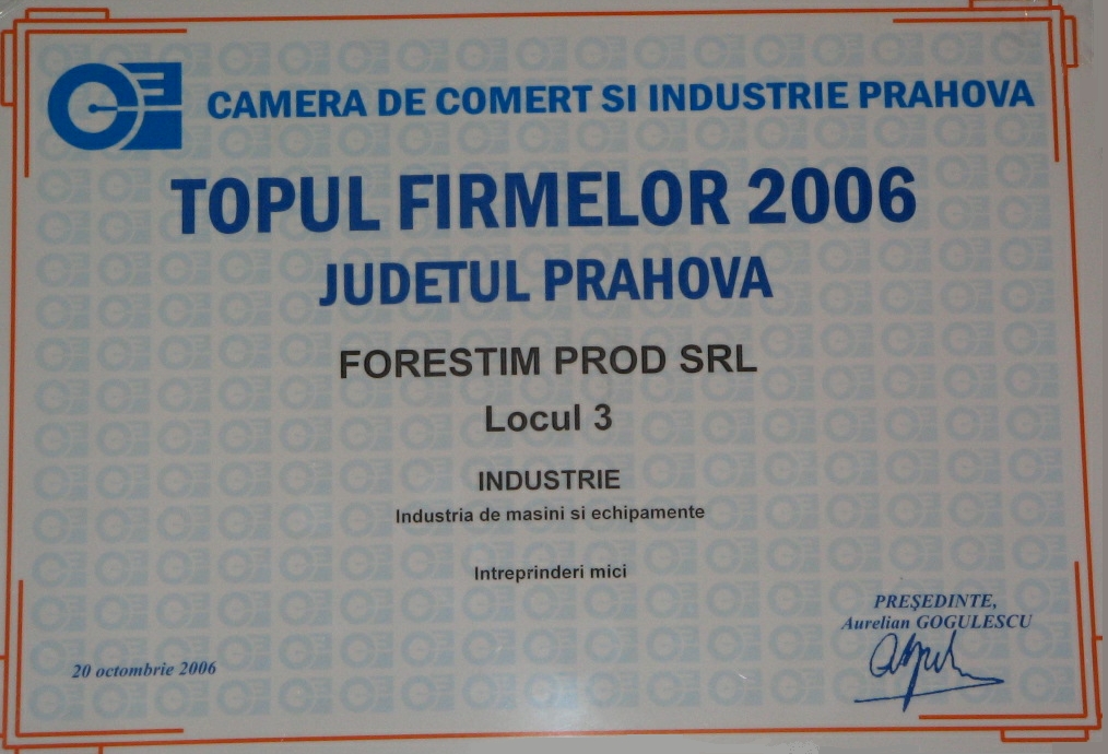 Locul 3 in topul Camerei de Comert si Industrie Prahova realizat pe anul 2006 la categoria "Industria de masini si echipamente".